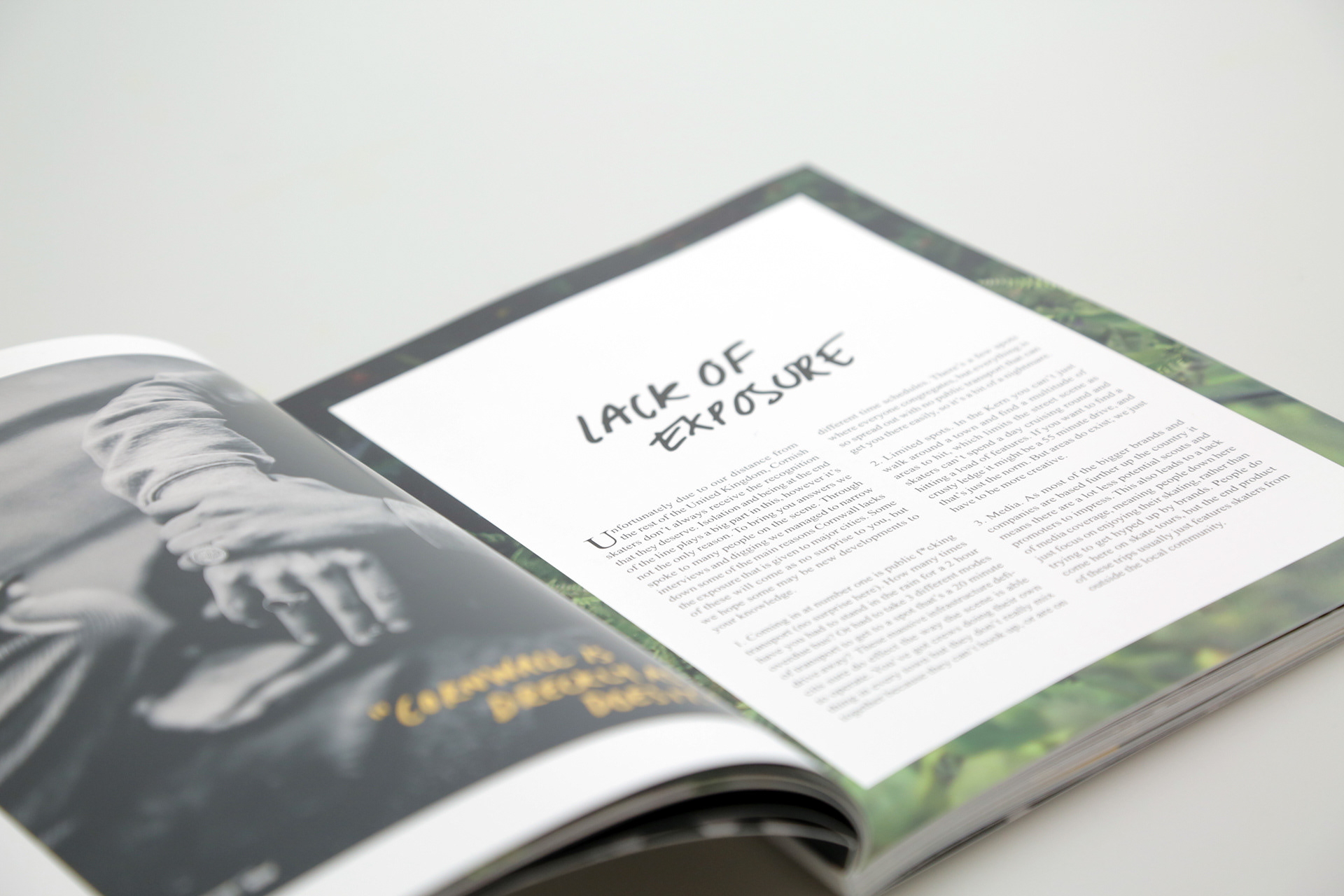 Forty Eight to One is an independent Cornish skateboarding magazine. Made by skaters for skaters, the aim of this magazine was to share and uncover upcoming events and people within the county. With media and pros flocking to the main cities, skate culture in Cornwall is being left behind, with up and comers not getting the recognition and exposure they deserve. We therefore wanted to try and help put Cornwall more firmly on the map. Using this magazine we interviewed key voices within the area whilst also exploring: spots, street areas and parks. The final magazine consisted of 104 pages, with over 1,000 copies printed at a size of 168mm x 238mm on 170gsm silk paper. As well as online the magazine was also stocked & sold at The Palomino Club, Sessions, Flavour, Mount Hawke, TR7, Choccy’s and The Edge Of Adventure.