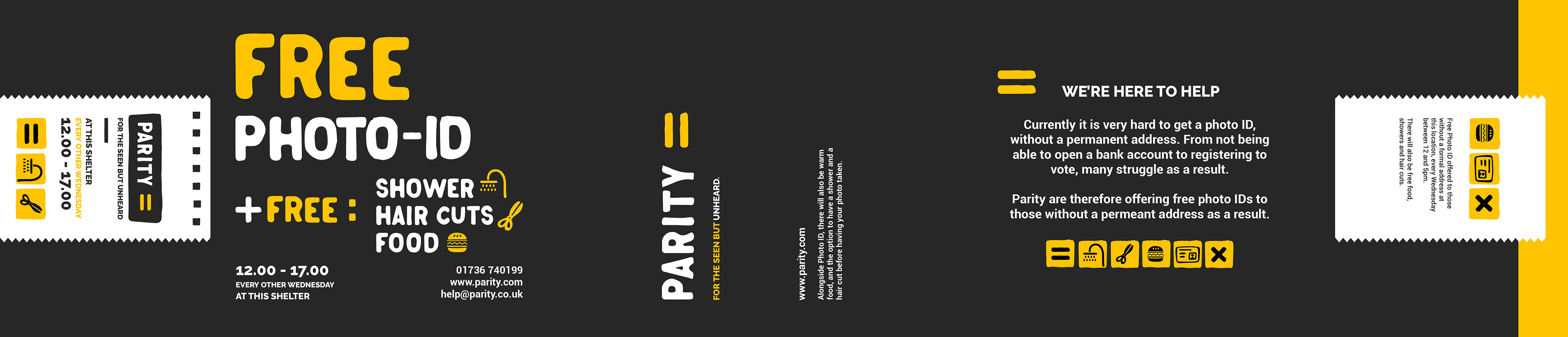 Parity is an organisation fronting a campaign aimed at the homeless community. It will be used as an outreach by shelters and charities. The project's aim is to endorse and offer free photo IDs. This shall be achieved through a mobile photo booth. Whereby a truck will turn up in a location every two weeks, offering anyone entering a free ID. Whilst giving details for this identification, the audience will be given the option to opt into vote registration. To entice the community into the stand, free showers, haircuts and food will also be offered; to limit any self consciousness the audience may face in having their photo taken. To advertise the event I used 3 main outputs, focusing on food hand outs, posters and a motion billboard to stipulate when the parity truck would be arriving at the exact location of the advertising material.
